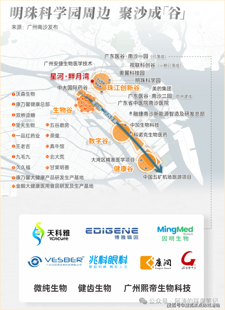 世界一流科学城,核心起步区「南沙硅谷」的明珠科学园,已进驻中科院等10多家研究院及科研机构。且周边云集广东医谷、中大药谷、生物谷等众多产业园,已落地王老吉、茶里、天科雅等企业400多家。
