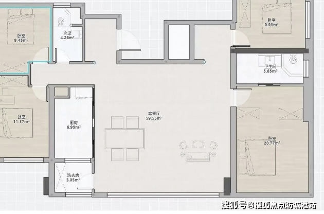 建面约133㎡ 四房两厅两卫: 创新“四叶草”动静分区设计,四个卧室分布于客厅四角,互不干扰。约7.4米南向宽阔阳台,连接客厅与次卧,空间感媲美传统170㎡户型。此户型是进入白鹅潭核心区高品质社区的高效门槛之选。