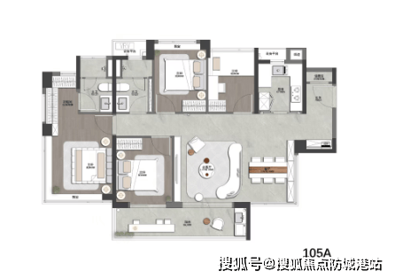 建面约 105 平四房户型,四开间构筑约 12.8 米南向面宽,通风采光效果极佳。真四房设计确保每个卧室空间宽敞,入户玄关柜增强收纳功能并保护隐私;LDKG 一体化大空间采用无承重墙设计,可伴随家庭周期成长改造,适配不同阶段生活需求;主卧套间配置独立衣帽间与 270° 环幕飘窗,尺度感与仪式感拉满。