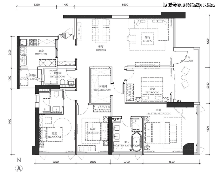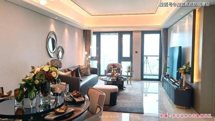 上图是楼王的客餐厅,客厅最里面是一面全景落地玻璃窗,旁边的门口出去就是阳台。落地窗的采光和景观都非常棒,弥补了偏置阳台的缺陷,而且节省了半个阳台的面(房)积(款)。