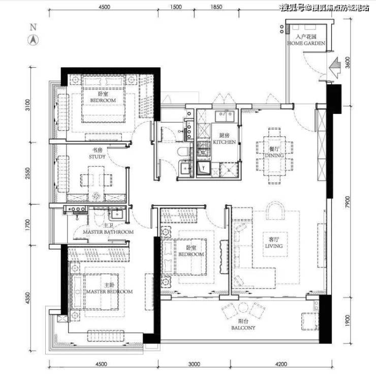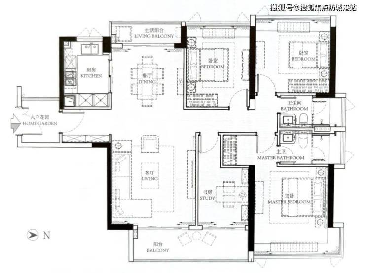 点评:本户型带入门花园,可以当生活阳台使用,而且和玄关相连,归家仪式倍增;“景观阳台--客餐厅--生活阳台”连成一线,东西朝向,早晒晚晒,采光指标爆表。