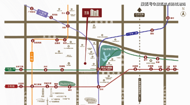3) “3 线地铁交汇枢纽”:项目附近就是全亚洲最大的地铁枢纽——天河公园站。该站全部建成后将是地铁 21 号线、13 号线二期 以及 11 号线的换乘站,目前已接通 21 号线。