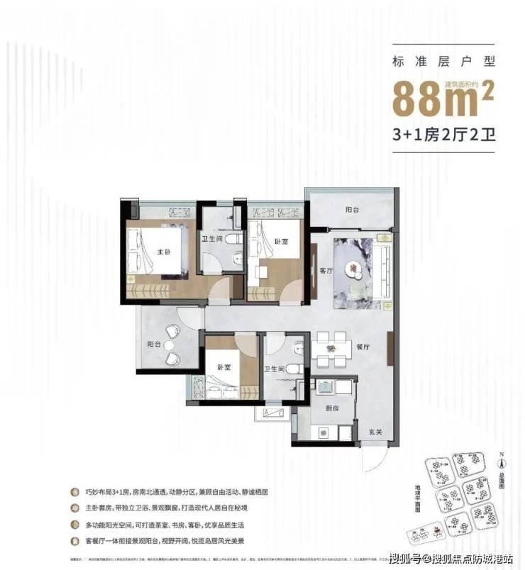 如果要评选能建·湾区金融城的“明星户型”,88㎡的四房绝对榜上有名。在不到90平米的面积里做到四个房间,这在业内被称为“神户型”,体现了极高的空间利用率和设计功底。