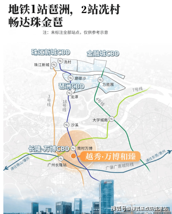 越秀・万博城 | 和臻坐落于长隆万博 CBD 核心,首推的 CBD 组团位于锦绣香江别墅群中间,与万博商务区直线距离仅约 600 米,步行可对望海印又一城,周边天河城、四海城、万达广场等成熟商业步行可达。交通上,项目距离地铁 7 号线与 18 号线交汇的南村万博站 E1 口约 1.3 公里,骑行接驳便捷,双地铁可一站直达广州南站、老黄埔、科学城、琶洲、珠江新城,通勤高效;自驾则可依托万博成熟路网,快速衔接城市各处,出行选择多样。