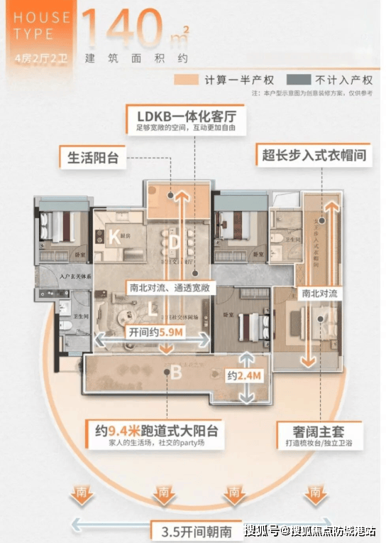 建面约140㎡四房全景大宅:约9.4米跑道式阳台,南北通透,客厅与主卧尺度超越部分170㎡产品,家庭聚会、观景休憩皆宜。