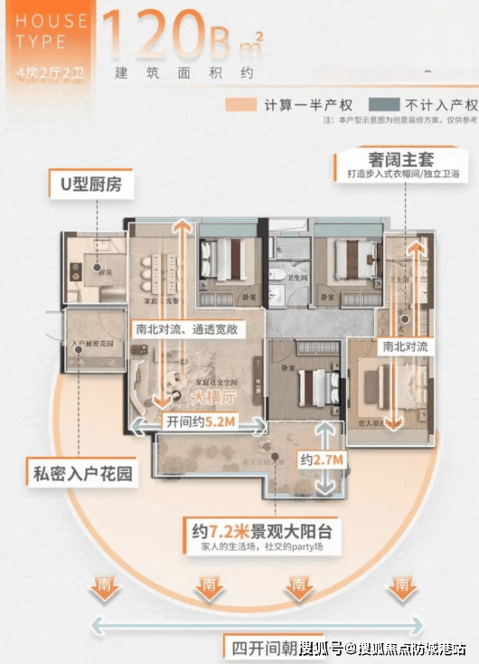 建面约120㎡四房两厅两卫(A/B双户型):A户型可打通客厅与卧室,打造大平层级奢阔空间;B户型为横厅设计,带入户花园,四房均实用均衡;