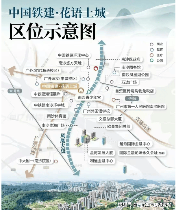 花语上城坐落于南沙核心腹地——凤凰大道与黄阁南路交汇处,恰好处在区政府板块与明珠湾CBD的黄金连接带上。这条贯穿南北的“城市脊梁”,串联起蕉门河中心区、灵山岛尖、横沥岛、万顷沙等南沙最具价值的高能板块,堪称南沙的“黄金发展轴”。