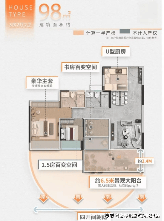 建面约98㎡三房两厅两卫:使用感媲美120㎡旧房,6.5米景观阳台+6米进深书房,双胞胎家庭亦从容;
