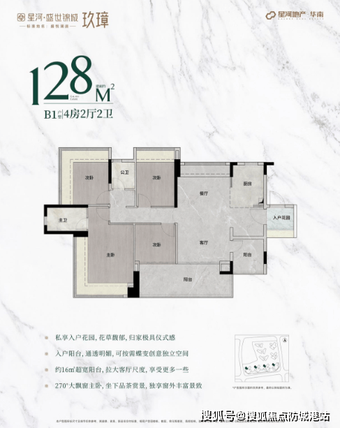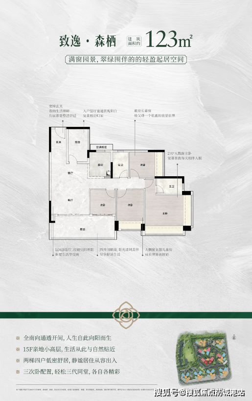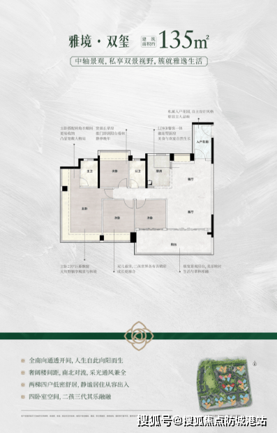 135-138㎡世家格局户型:配备270°飘窗主卧,三面采光,框景入室,实现了生活功能与美学体验的双向平衡。