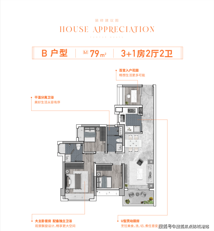 珠实·云悦花语在装修方面甄选全球知名品牌的装修材料和家居设备,确保品质卓越。户型设计注重实用性和舒适度,主打建面约70 - 113平方米的三至五房户型,实用率高,同等面积多享一房,采用合理的空间布局,保证了充足的采光和通风。部分户型如98平方米的四房两厅两卫户型有南向约7米景观阳台,尽显尊贵,以人性化设计与精湛工艺,雕琢每一处细节,奢华格调不彰自显,礼献品质生活典范。