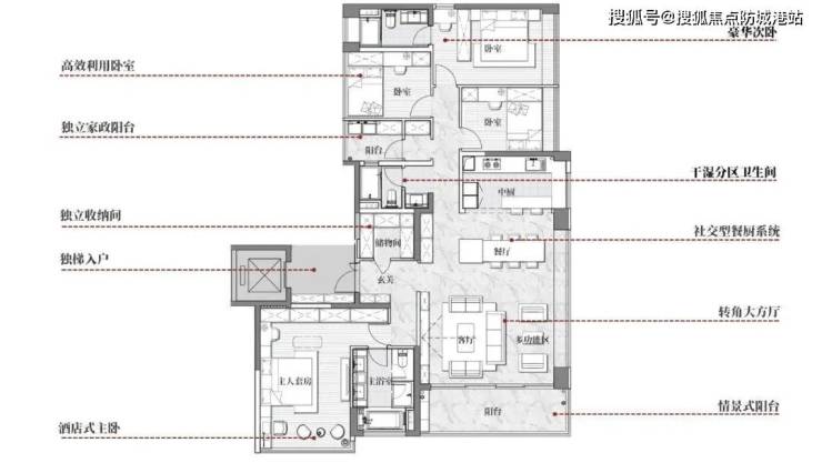 户型集创新型居住之大成,超大转角方厅结合超长转角阳台实现景观资源最大利用,可分合儿童房、独立家政空间更加满足现代客户的育儿生活需求。一户一梯顶级归家体验,打造真实的豪华人居体验。