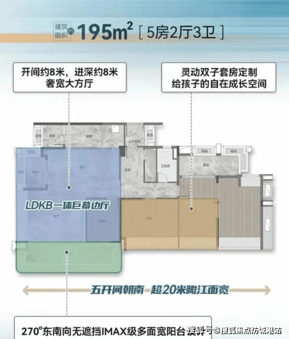 195㎡大四房:LDK一体化客餐厅面积超70㎡,双侧观江面合计约16米,8米长阳台直面珠江,空间尺度堪比五星级酒店江景宴会厅。