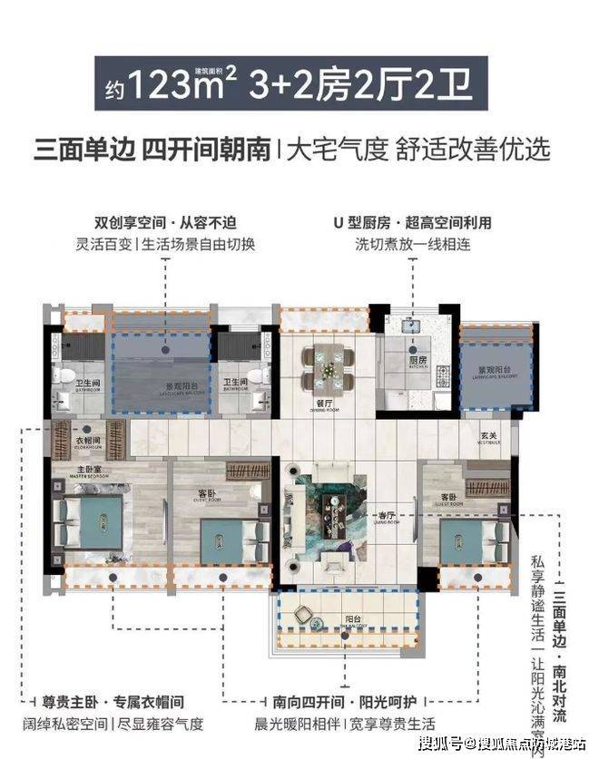 建面约 123㎡5 房 2 厅 2 卫:能在 123㎡的面积内做到 5 个房间,在市场上实属少见。主卧带有衣帽间,满足主人对于衣物收纳和品质生活的追求。餐厅的飘窗设计不仅增加了空间的趣味性,还十分实用,可作为休闲阅读或临时储物的区域。
