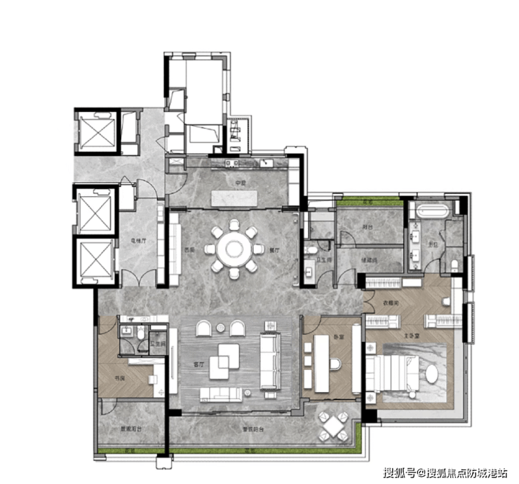 最大面积的约268平户型,则做到了3T2户的私密体验,其中包含1部保姆电梯,业主独梯入户,和保姆分开,既保证了业主的私密性,又方便保姆日常工作,这种设计,在天河核心区的改善盘里,非常少见。