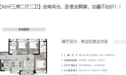 92㎡三房二厅二卫:全南采光设计,卧室均带飘窗,提升了居住的舒适性。