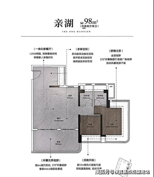 98㎡四房:总价约353万,户型方正无浪费,设独立玄关、客餐厅一体、主卧套房带独立卫浴,全景飘窗提升采光与视野,是入门级改善的高性价比之选;