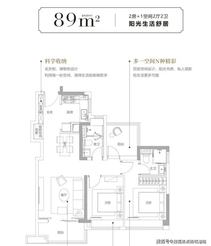 首先来看建面约89㎡的三房两厅两卫户型,这堪称是同面积段内的“卷王”。在传统的认知中,89平米通常只能做成紧凑的三房一卫,甚至两房两卫。但中铁阅江来打破了这一常规,做到了三房两厅两卫,且是三开间朝南的经典竖厅设计。这一设计的巧妙之处在于,它在控制总面积从而降低总价的同时,极大地拓展了功能空间。多出来的一个卫生间,解决了早高峰时期家人抢厕所的尴尬,提升了生活的便捷度。三开间朝南,使得客厅和两个卧室都能沐浴在温暖的阳光下,采光效果极佳。此外,该户型的玄关收纳功能强大,设计了充足的储物空间,方便业主存放鞋子、雨伞、外套等物品,保持室内的整洁有序。对于年轻夫妇或小家庭来说,这个户型无疑是性价比之选,既满足了基本的居住需求,又不会造成过大的经济压力。