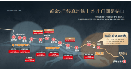 中建海丝城紧邻广州地铁5号线双沙站B口,距离仅50米,步行即可到达。这一得天独厚的位置使得居民能够轻松抵达金融城、珠江新城等核心区域,并通过换乘线路快速连接到广州其他CBD地区。对于需要频繁出行的城市白领来说,这里无疑是最佳选择之一。