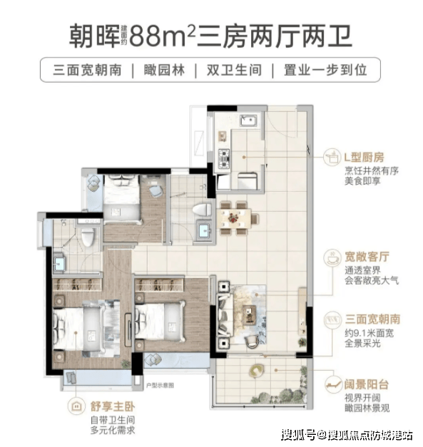 户型采用全南向布局,客厅和三个卧室均朝南,能够最大限度地享受阳光照射,让房间内保持明亮通透,而且采光充足也能有效减少房间内的潮湿,提升居住舒适度。另外,户型的卫生间采用干湿分离设计,洗漱、如厕、淋浴互不干扰,既保证了卫生间的整洁卫生,又提升了使用效率,早上家人一起上班、上学的时候,也不会出现排队使用卫生间的尴尬。