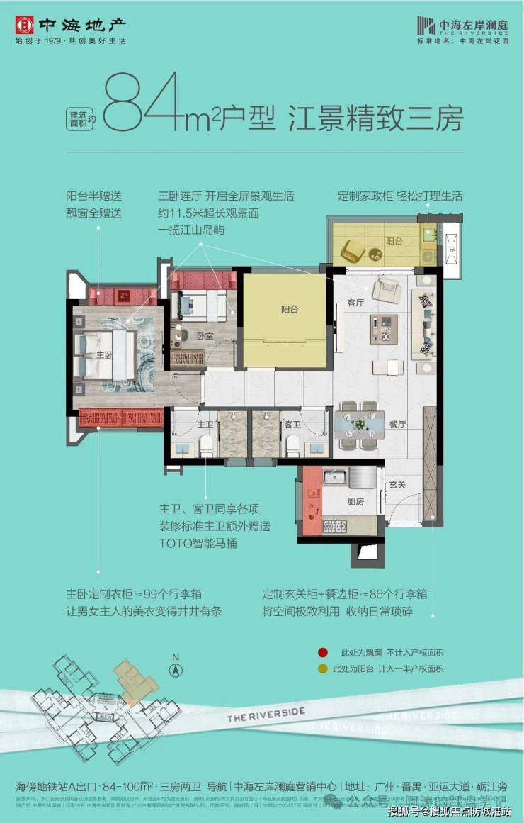 中海左岸澜庭目前在售户型主要为 84-91㎡的精致三房。这些户型经过精心设计,充分考量了现代家庭的居住需求。方正实用的格局,动静分区的布局,南北通透的朝向,使得每一寸空间都得到了高效利用。客厅宽敞明亮,连接超大阳台,将室外的阳光和风景引入室内;卧室温馨舒适,配备飘窗设计,增加了使用面积和采光效果;厨房操作台面充足,动线合理,让烹饪成为一种享受;卫生间干湿分离,整洁卫生,提升了生活品质。