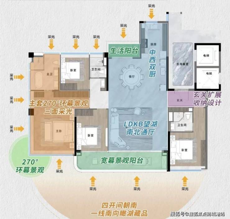 项目南向紧邻3.3万平方米太阳湖,最近直线距离仅约40米,坐拥约300米瞰湖岸线。实测数据显示,湖景户型占比超70%,270°环幕落地窗设计,让业主在家中即可欣赏波光粼粼的湖面,感受自然宁静。