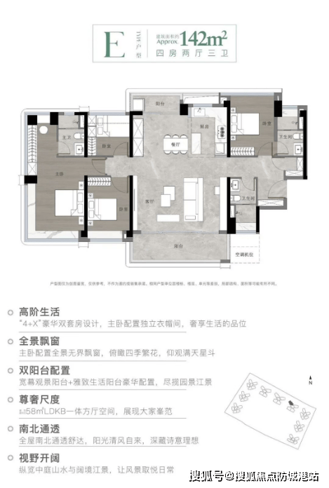 首开的文元组团内共有9栋住宅,分东西北三侧环绕分布,南侧全部留空便于采光。项目主打南向户型,所有户型均为超100%使用率,包括79平方米三房两卫、94平方米三房两卫、108平方米双套间四房两卫及142平方米双套间四房三卫。这些户型设计合理,注重居住舒适度,特别是大面积户型配备了240度窗景的主卧室,极大地提升了居住体验。