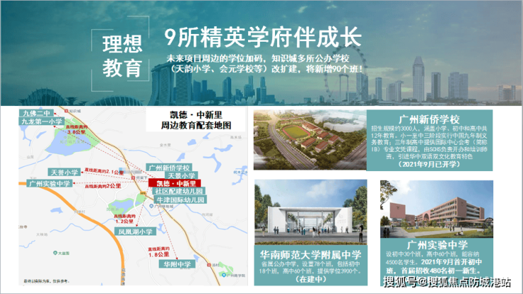 项目周边教育资源丰富,从幼儿园到高中形成“一站式”优质教育体系。华师附中(初中、高中)已落子知识城,周边还有广州新侨学校、广州实验中学、会元中小学、天景小学、九佛二中、凤凰湖小学、牛津国际英豆尔幼儿园等,满足家庭成长型教育需求。