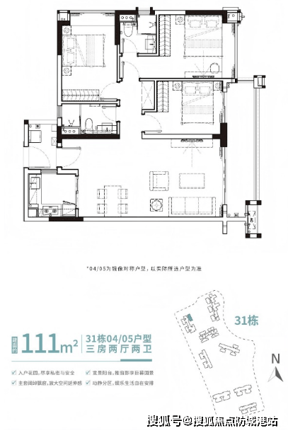 105㎡四房:类专梯入户,270°主卧观景舱,得房率100%;