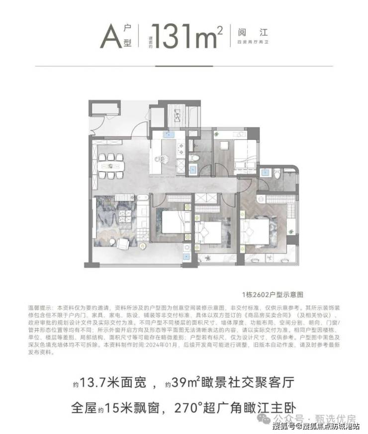 建筑立面采用钻感鎏金天幕,辉映顶部金色徽标,迭代区域居所的美学穹顶;约130m天幕地标,将楼体朝江旋转15°,户户东南向270°观景,实现江景平权的瞰江体验。
