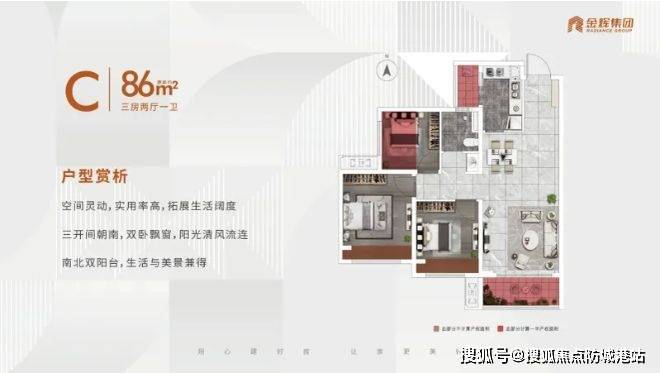 客厅与餐厅一体化设计,使空间开阔通透,视觉上更加宽敞。厨房采用 “L” 型设计,操作台面充足,洗切煮动线流畅,满足日常烹饪需求。三间卧室布局合理,主卧空间宽敞,可放置双人床及衣柜,保证舒适睡眠空间;次卧可作为儿童房或书房,满足不同需求。卫生间干湿分离,提高使用效率,保持空间干爽。整体户型动静分区明确,休息区与活动区互不干扰,总价 86 万起还送 8 万装修包,性价比极高。