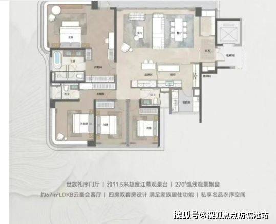 228㎡四室两厅三卫:配备约 11.5 米超宽江幕观景台和约 67㎡LDKB 云峯会客厅,双套房设计,满足家族居住需求。售楼处电话:4009909752。