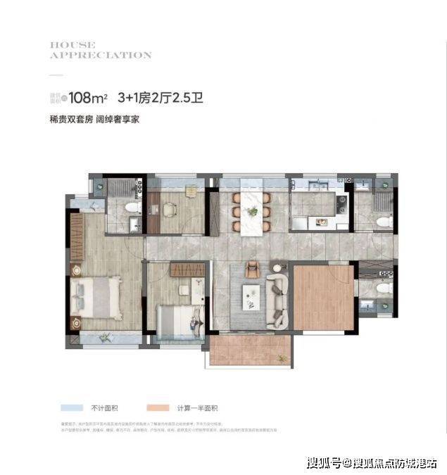 D 户型:4 房 2 厅 2.5 卫,建面约 108㎡