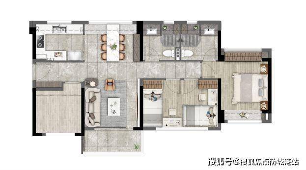 A 户型堪称佛山少见的创新实用型三房,专为新青年打造理想居家空间。主卧带 0.5 个卫生间,在满足实用需求的同时,巧妙地不多占面积,既保证了主人生活的便利性,又提升了空间利用率。全屋三开间朝南,通风采光极佳,阳光洒满每一个角落,舒适感满满。令人惊喜的是,该户型得房率高达 91% +,功能性三房设计,让居家尺度恰到好处,无论是放置家具还是日常活动,都不会感到局促。对于预算有限但又渴望拥有舒适三房的新青年来说,这个户型无疑是绝佳选择。