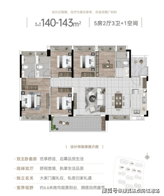 建面约143㎡五房户型:该户型为高端改善户型,五室两厅三卫设计,户型宽敞大气,南北对流,采光通风极佳,空间布局合理,动静分区明确,休闲、休息互不干扰;客厅超大,连接全景景观阳台,可全方位欣赏马鞍山山景与社区园林景观,视野极佳;主卧带独立卫生间、衣帽间、观景飘窗,尊享奢华居住体验;四个次卧面积充足,可满足多孩家庭或三代同堂的居住需求,同时可设置书房、健身区等,兼顾休闲、工作、健身等多元需求,打造高品质的居住空间。