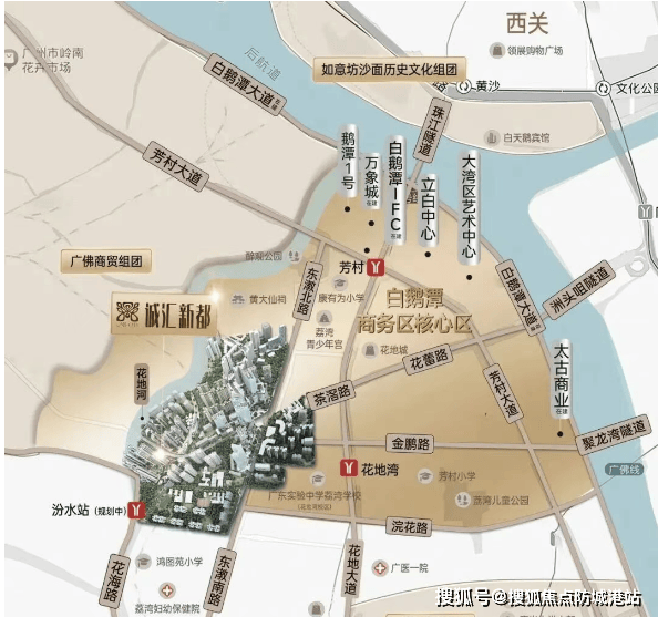诚汇新都·榕诚湾,坐落于广州荔湾区白鹅潭CBD核心区,是茶滘旧改项目中率先面世的高端住宅组团。项目占地约5.2万㎡,总建面达22.6万㎡,由8栋超高层住宅组成,规划1585户,容积率3.5,绿地率高达47%,在寸土寸金的主城区实属罕见。其最大亮点在于紧邻花地河,部分楼栋实现南向无遮挡一线望江,真正兑现“推窗见水”的滨江生活想象。更关键的是,它身处白鹅潭商务区这一广州西部战略引擎——未来将聚集超200家总部企业、打造国际级滨水都会。而榕诚湾恰好位于该片区西南门户,东接广钢新城、西临佛山边界(直线仅1.2公里),既享主城成熟资源,又具广佛融合红利。作为200万㎡城市更新大盘的首发住宅,它的稀缺性不言而喻。