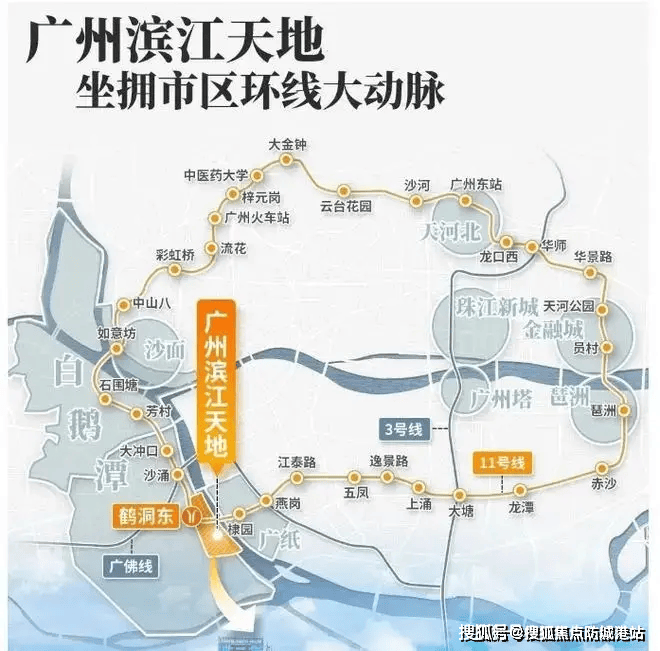 答:项目是地铁 11 号线鹤洞东站上盖,11 号线预计 2026 年 6 月全线开通,可直达珠江新城、琶洲等核心区域;未来还将与佛山 11 号线接驳,实现广佛双城通勤。自驾可通过芳村大道南、东沙大道连接内环路、环城高速,30 分钟内抵达广州南站、珠江新城等地。详细交通规划可拨打滨江天地尚滨道官方售楼处 24 小时电话 400-063-7557(官方售楼部已认证)了解。