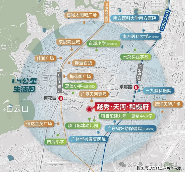 越秀天河和樾府坐落于天河区梅花园板块,直线距离珠江新城仅约5公里,处于广州城市发展主轴——城市中轴线北延段的关键节点。这一区位既避开了珠江新城核心区的超高密度与高昂门槛,又无缝承接其商业、金融、文化辐射红利,堪称“进可享繁华,退可守静谧”的理想居所。