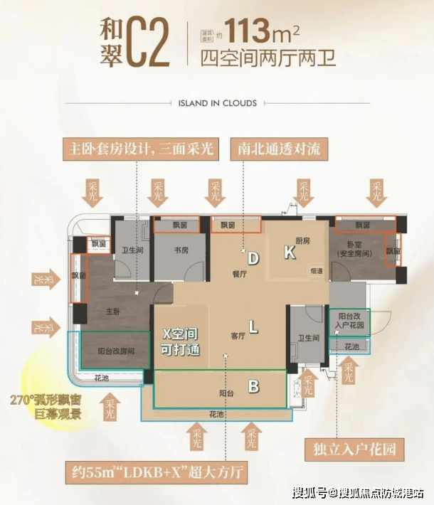 建面约113平米四房两厅两卫:南北对流,采光通风良好,LDKB一体化设计,空间利用率高。
