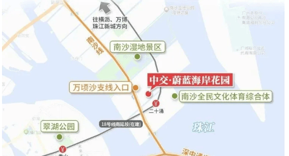 中交蔚蓝海岸坐落于南沙区万顷沙镇二十涌,是广州“双核”南拓轴心与黄金内湾的核心节点。项目周边规划为国际科创枢纽,距深中通道南沙支线出口仅1公里,30分钟直达深圳前海;地铁18号线南延线(在建)二十涌站约500米,2027年通车后,25分钟直达珠江新城。