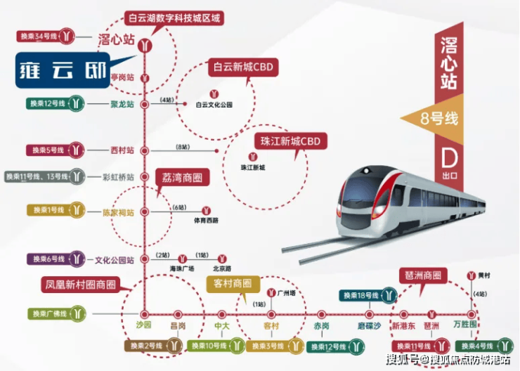 公共交通方面,项目紧邻地铁8号线滘心站,步行距离约650米,日常通勤便捷高效。地铁8号线被誉为“换乘之王”,贯穿老荔湾、海珠西、客村、琶洲等核心区域,设有八个换乘站,可轻松换乘1号线、2号线、3号线及广佛线,快速通达广州各城区。