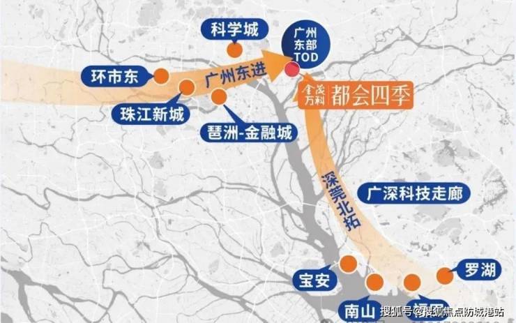 广州东进战略的实施,广州城市中心不断往东转移,从环市东——珠江新城——珠江新城、琶洲、金融城三足鼎立的城市格局,随着广州第二CBD(黄埔临江区域)的建设和增城新塘的崛起,广州东进步伐势不可挡。新塘作为广州东进桥头堡,与广深科技走廊共同汇集与此,形成湾区发展"A字顶点“,享受东进、北拓发展红利。