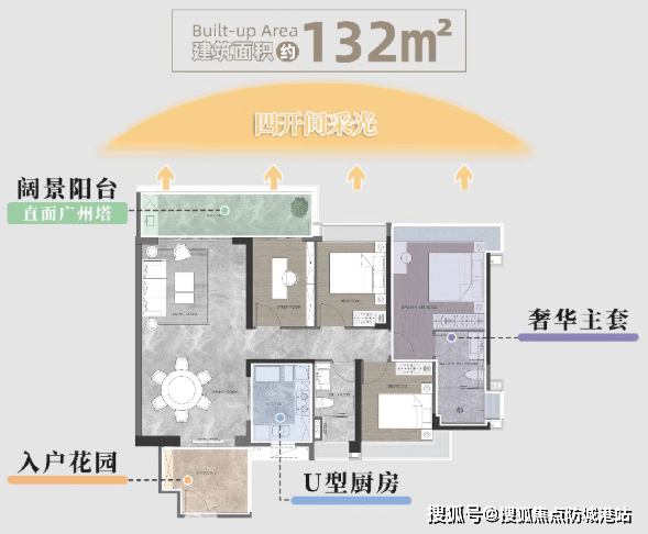 项目在售户型面积段为93至132平方米,涵盖三房至四房的主流改善需求。得益于30度的楼体扭转设计,所有户型均实现了极佳的采光与通风效果。尤其是北向户型,凭借无遮挡的视野优势,将广州塔的雄姿与珠江的秀色毫无保留地纳入室内。宽敞的楼间距让每一户都能享受到充足的日照,巨幕玻璃窗则将室外的美景无限延伸入室,实现了室内外的完美交融。