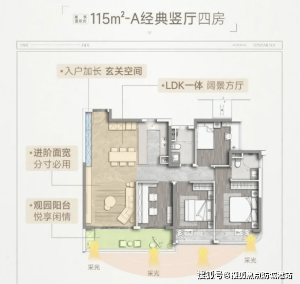 约115㎡南北通透四房:经典竖厅设计,动线合理,通风采光俱佳,兼顾家庭成长与社交需求;