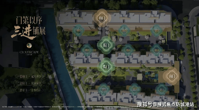 社区园林以“三进归家礼序”为骨架:一进府门,迎宾水景与照壁营造仪式感;二进院门,通过风雨连廊串联各栋;三进宅门,直达专属电梯厅。沿途设置清芬阶、吟月池、无事亭等六大主题节点,其中“吟月池”为下沉式山水会客厅,叠石飞瀑、曲径回廊、镜面水景交织,复刻余荫山房“玲珑水榭”的意境。