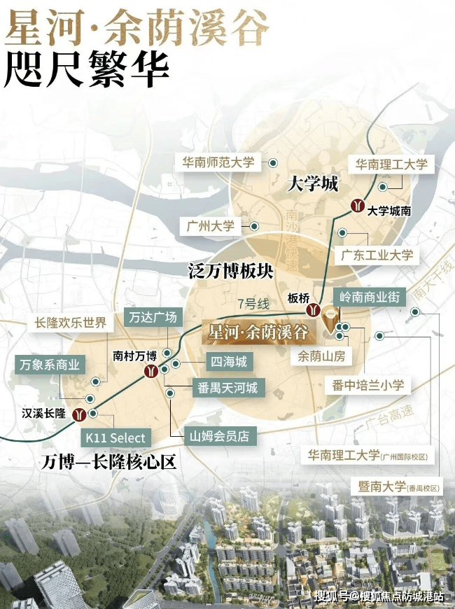 通勤效率是改善型买家的重要考量。星河·余荫溪谷距地铁7号线板桥站实测约503米,步行约7分钟可达。7号线作为广州东西向骨干线,2站抵万博CBD,1站达大学城,5站至琶洲会展区,6站进入珠江新城核心区。对于在金融城、琶洲、万博等新兴商务区工作的群体,通勤时间可控制在30分钟内。