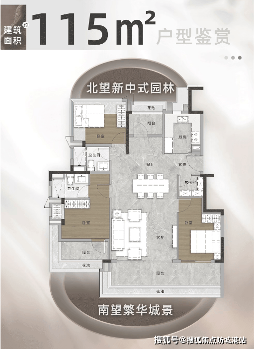 约90-94㎡横厅三房两卫:客餐厅开间约6米,主卧带270°飘窗,通透感强;