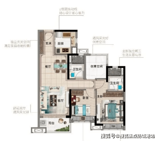 建面约88㎡户型:双阳台配置是该户型的一大亮点,分别为景观阳台和生活阳台,实现了观景与实用的分离。南向园林景观让室内采光充足,通风效果好;带主套设计提升了居住舒适度,生活阳台预留洗衣机位置,方便日常家务处理。