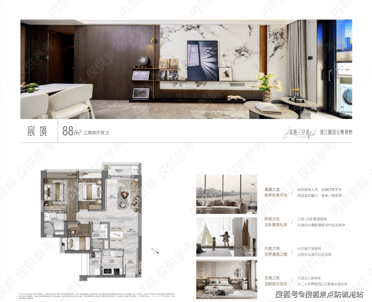 项目主推建面约76-137㎡全维度户型,涵盖三居至四居,精准覆盖不同家庭需求,价格极具竞争力:江景三房78㎡308万起,纯南三房88㎡340万起,园景四房98㎡378万起,江景大平层137㎡498万起,首付70万+即可入手三房,上车门槛友好。具体户型包括“沁境”76㎡三居双厅、“云境”78㎡三居双厅、“宸境”88㎡三房双厅双卫、“悦境”98㎡四居双厅双卫、“臻境”126㎡四房双厅双卫、“逸境”137㎡四房双厅双卫,户型设计兼顾实用性与舒适性,精准匹配刚需自住、刚改升级等多元置业需求。
