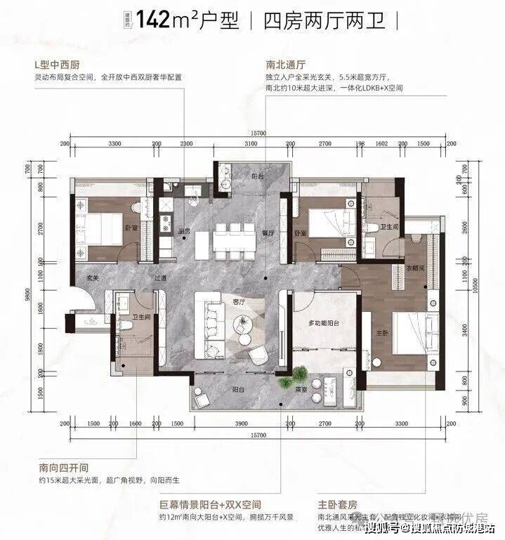 九、【LDKB无界一体化 享受“大平层”尺度】创新”LDKB+X空间”设计理念,客厅、餐厅、厨房、阳台+多功能空间一体化设计,满足家庭休闲、饮宴、社交、会客等功能,探索家的N种可能性,营造打动人心的生活场景。