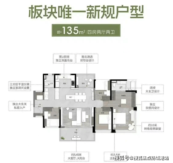 建面约135㎡户型:双阳台南北通透,5.25米大宽厅+5.45米景观阳台,主卧开间达3.6米,媲美部分140㎡以上产品。